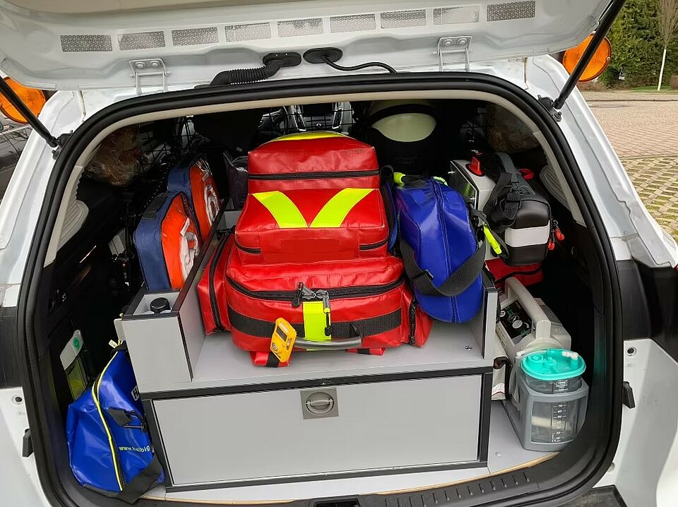 Unser Einsatzfahrzeug mit der notwendigen Sicherheitsausstattung, Blaulicht, Funk, Sonderbeklebung, medizinischen Einbauten sowie die Neubeschaffung von medizinischen Geräten entstanden Kosten i.H.v. ca. 33.000 EUR.
